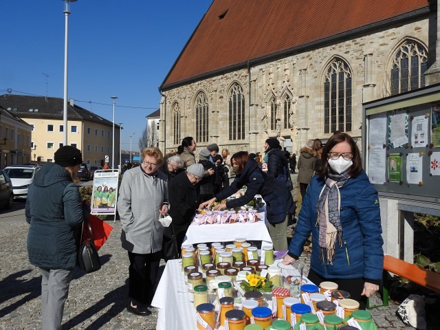 Etwa 200 Liter verschiedenster Suppen, abgefüllt in ca. 560 Gläser wurden von ungefähr 30 SuppenköchInnen letzten Sonntag anlässlich des Familienfastensonntags und zugleich des Suppensonntags der kfb gegen freiwillige Spenden am Kirchenplatz und am Stadtplatz angeboten.