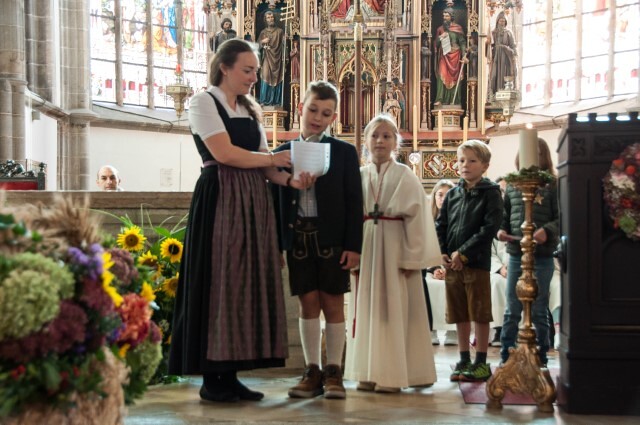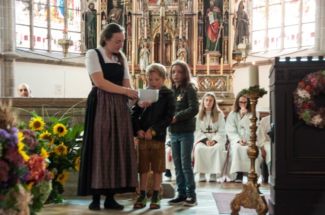 Die Kinder bringen die Gaben Brot und Wein zum Altar und erzählen dabei, wofür sie dankbar sind.