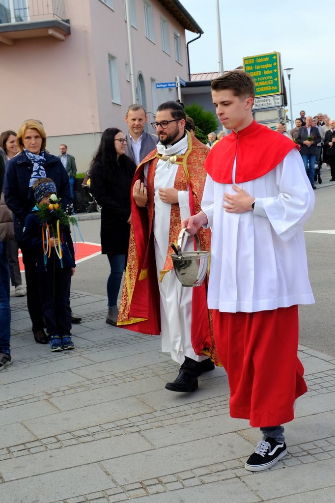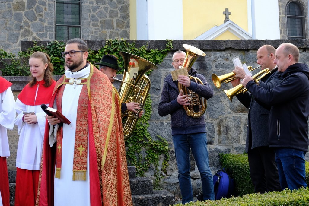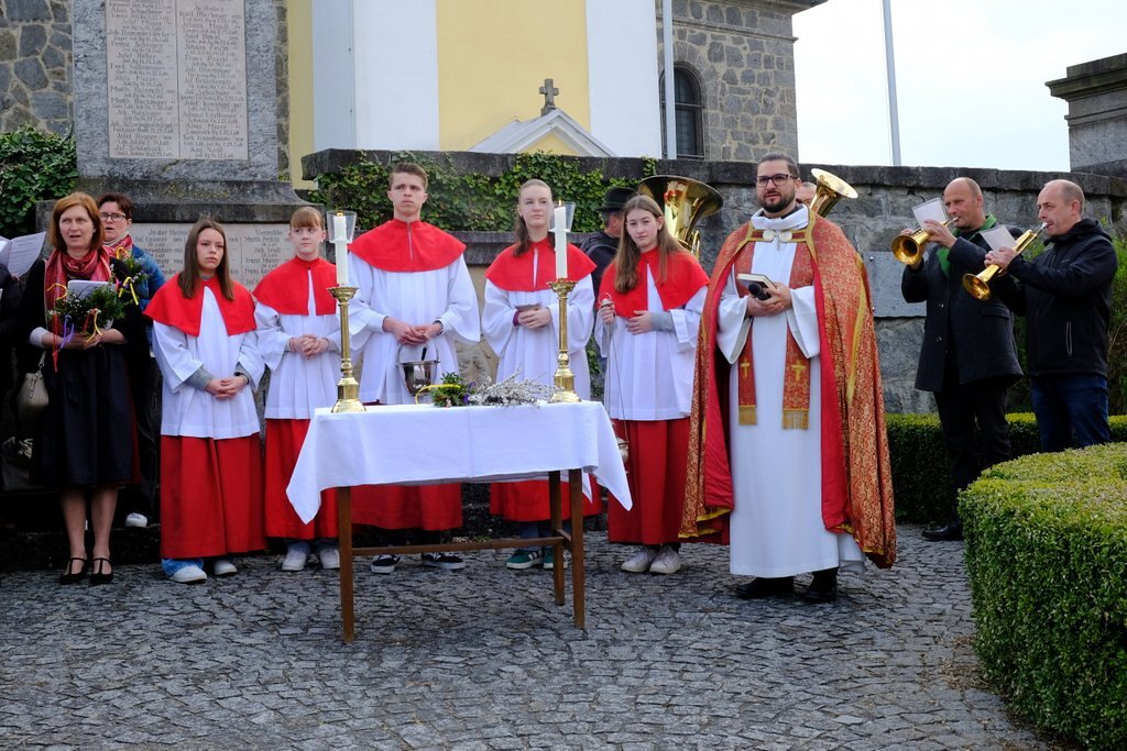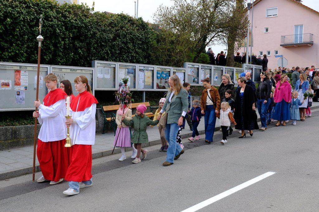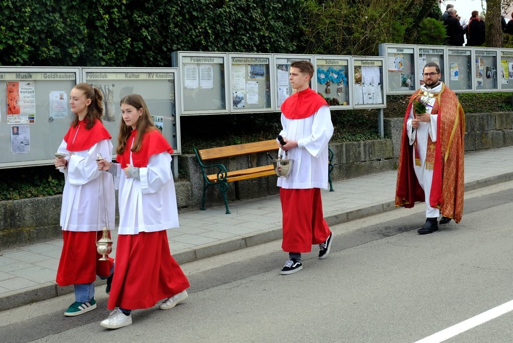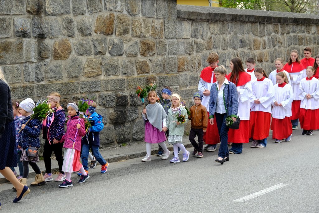 Nach der Palmweihe beim Kriegerdenkmal geht die Palmprozession in die Pfarrkirche zur Heiligen Messe. Angeführt wurde die Prozession von den Ministranten mit dem Kreuz, danach folgten die Kindergartenkinder und schließlich die ganze Pfarrbevölkerung.